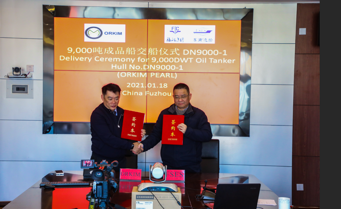 1月18日上午,东南造船为马来西亚ORKIM MARINE SDN BHD公司承建的9000吨成品油轮1号船顺利交付,为东南造船全力开启新年征程,迈出了奋进而又坚实的第一步。